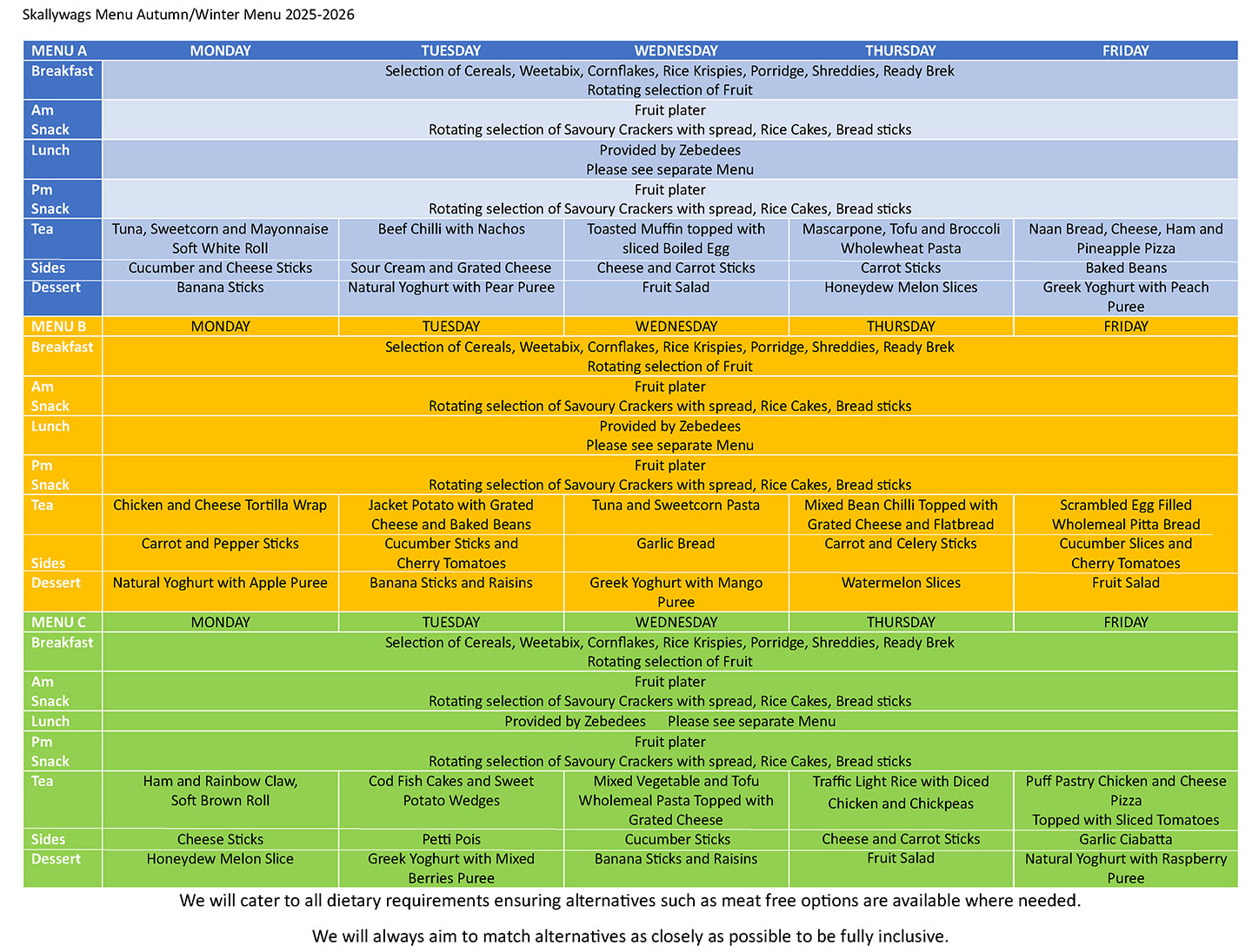 Children at Skallywags Nursery are provided with a varied, balanced, and nutritious diet that supports safer eating practices in line with the Early Years Foundation Stage (EYFS) 2025.